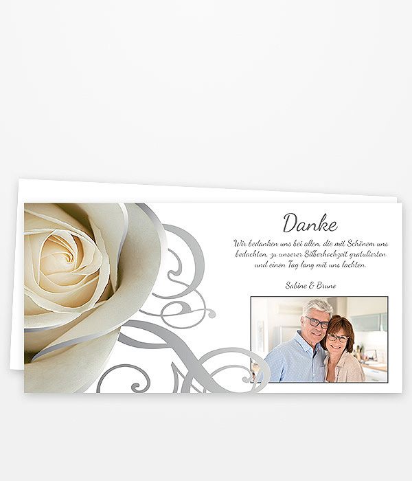 Die silberne Hochzeit ist ein stilvolles Fest. 25 Jahre sind Sie gemeinsam durch das Leben gegangen und haben Höhen und Tiefen gemeinsam genossen oder gemeistert. Das Edelmetall Silber spiegelt die Wichtigkeit dieses Anlasses gekonnt wieder. Die Farbe Silber ist elegant, stilvoll und dezent zugleich. Zarte oder intensivere Muster geben den Danksagungen zur Silberhochzeit jeweils einen anderen Stil. Motive wie Rosen, Ringe oder Noten unterstreichen Ihren persönlichen Geschmack. Dankeskarten zur Silberhochzeit wirken im Hochformat wiederum ganz anders als im Querformat.
