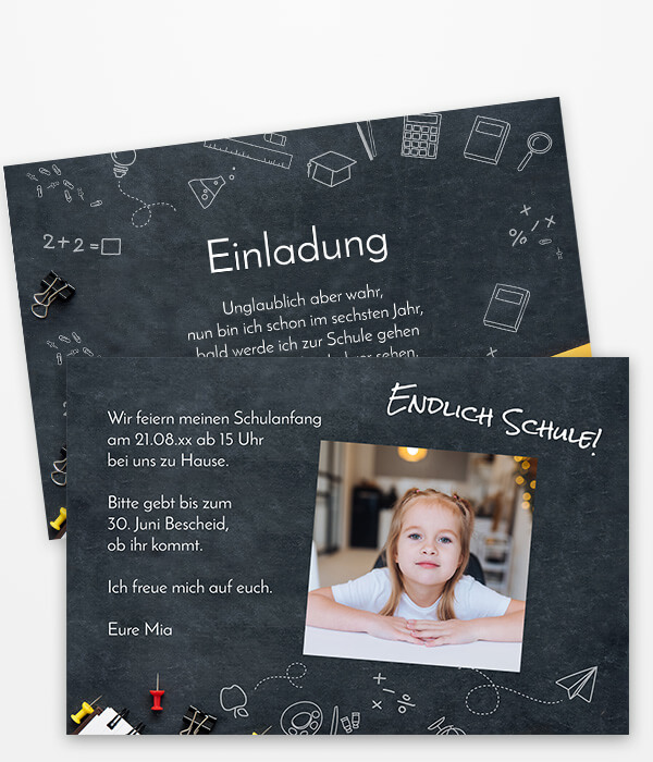 Einladungen Schulanfang und Einschulung mit Stiften, Tafeln und Kreide